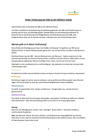 In dieser Verfassung geht es um Demokratiebildung und Partizipation – also darum, wie Kinder bei uns mitbestimmen und den Alltag in der GBS mitgestalten können.